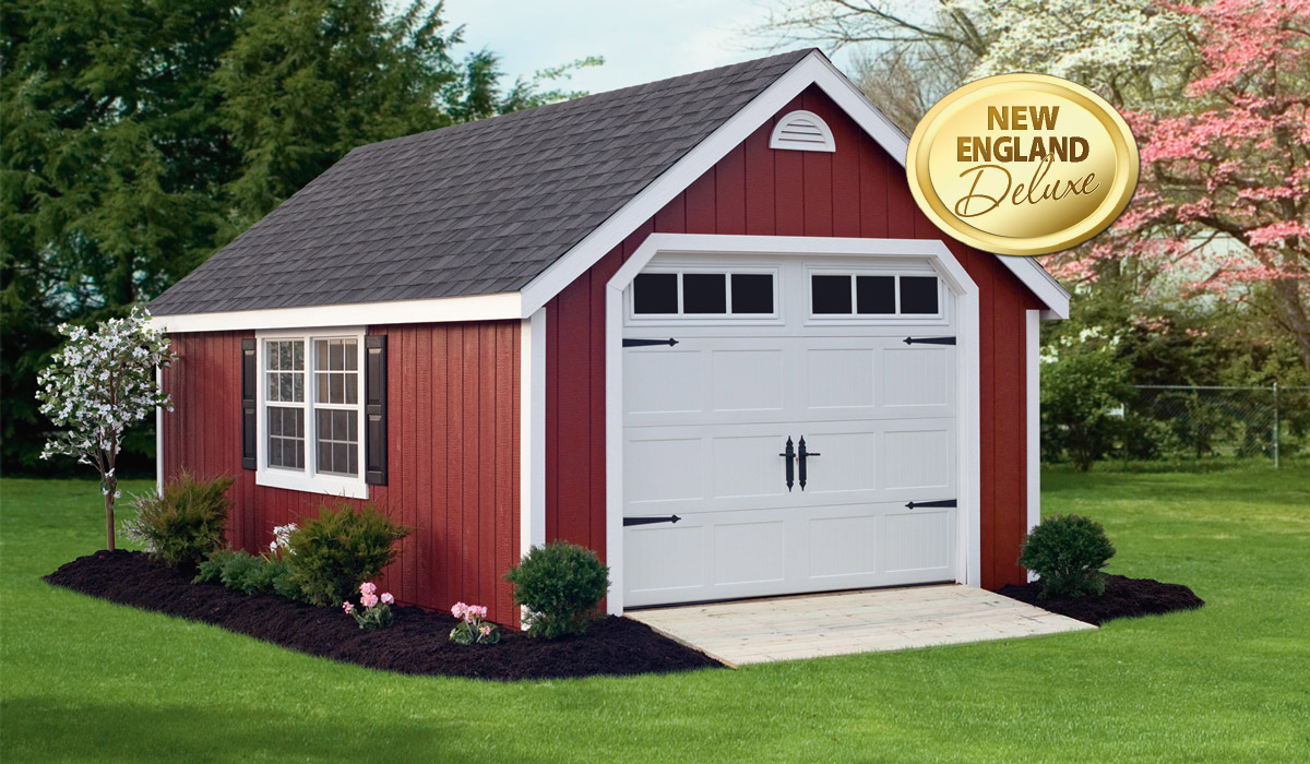 Our line of Garages draws on our most popular building and barn styles to create buildings large enough to store automobiles, boats and large equipment. Garages come standard with a steel overhead door and a heavy duty floor support system to carry thousands of pounds. You can choose between vinyl or wood exterior and standard or New England Deluxe trim. Consider upgrading your Garage with a ramp for added convenience.
