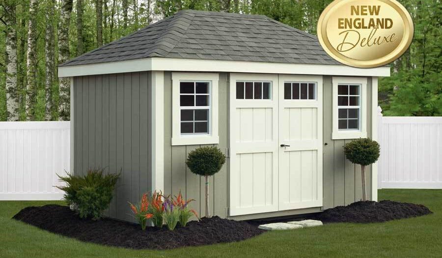 The New England Deluxe Trim package adds an artistic touch to your building. It features a wider 5″ trim and gives your building a wider overhang than buildings with the Signature Trim Package. The trim is a composite wood giving it an authentic-looking wood grain and it is resistant to rot. It is available in all of our 13 colors.